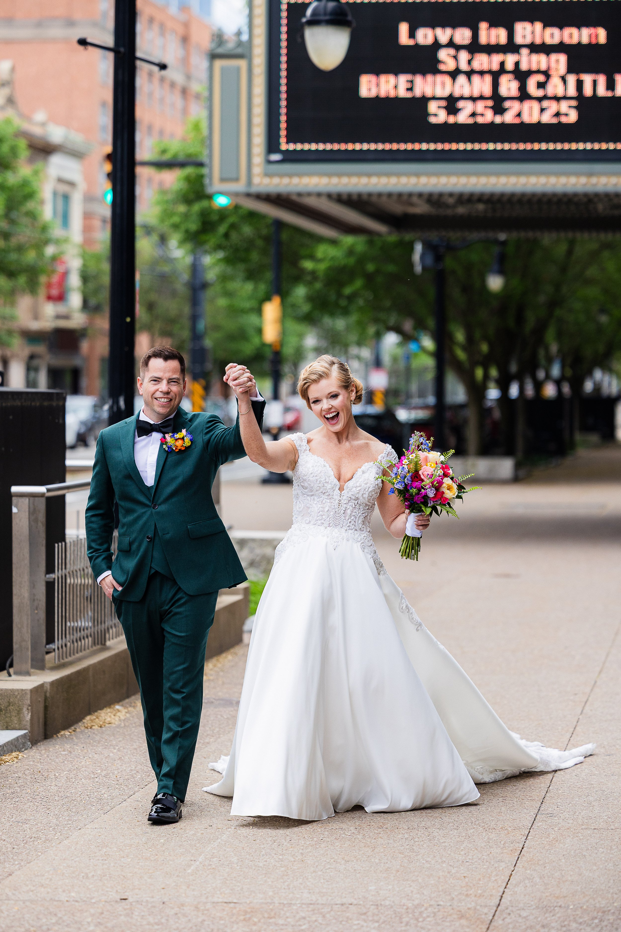 After wrapping up the first looks, we headed to Shea’s Performing Arts Center, where Caitlin surprised Brendan with their names and wedding date shining brightly on the marquee, a Broadway-worthy moment big enough for an encore. One of my personal favorites was capturing Caitlin & Brendan sharing a kiss as a train rolled by just behind them!